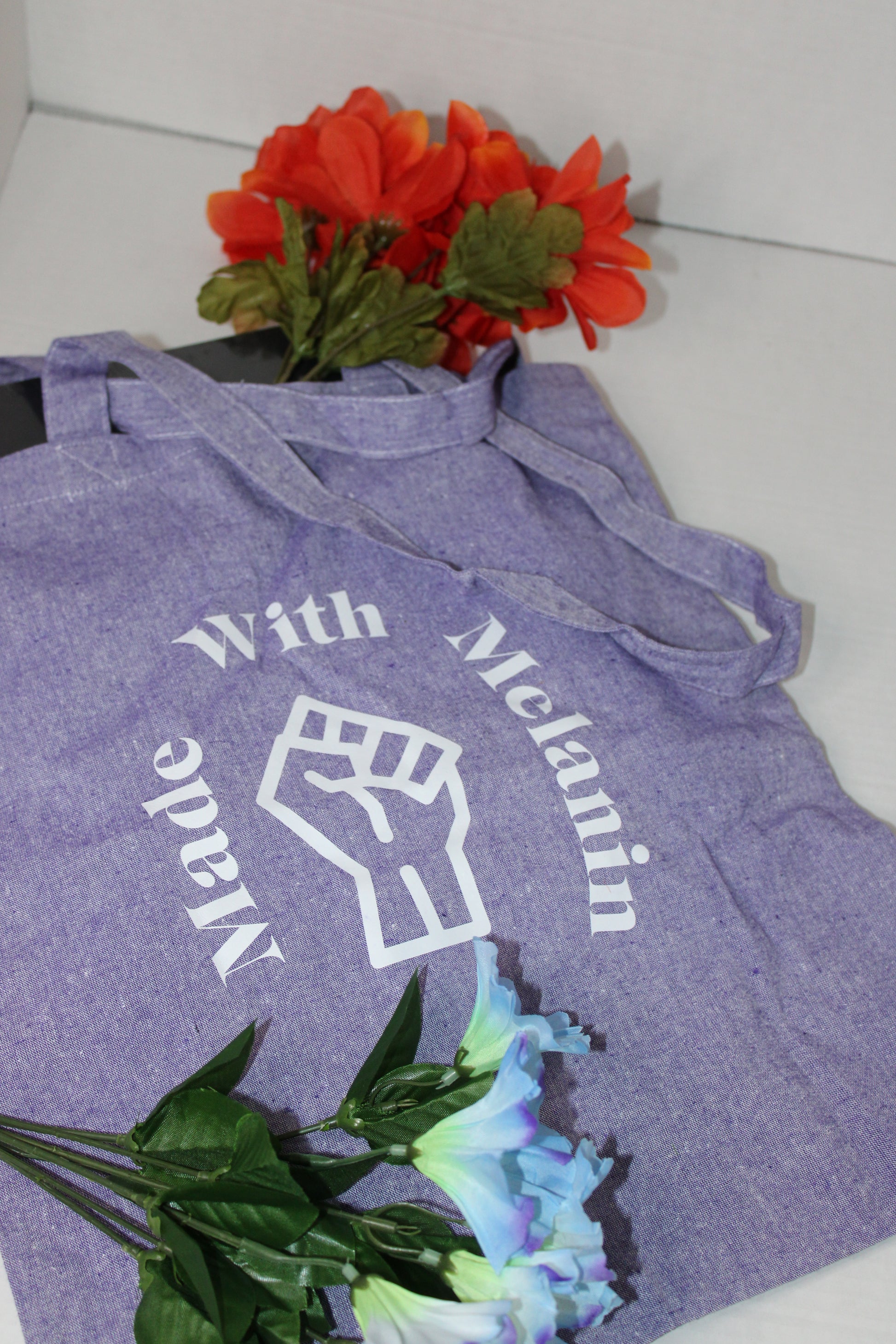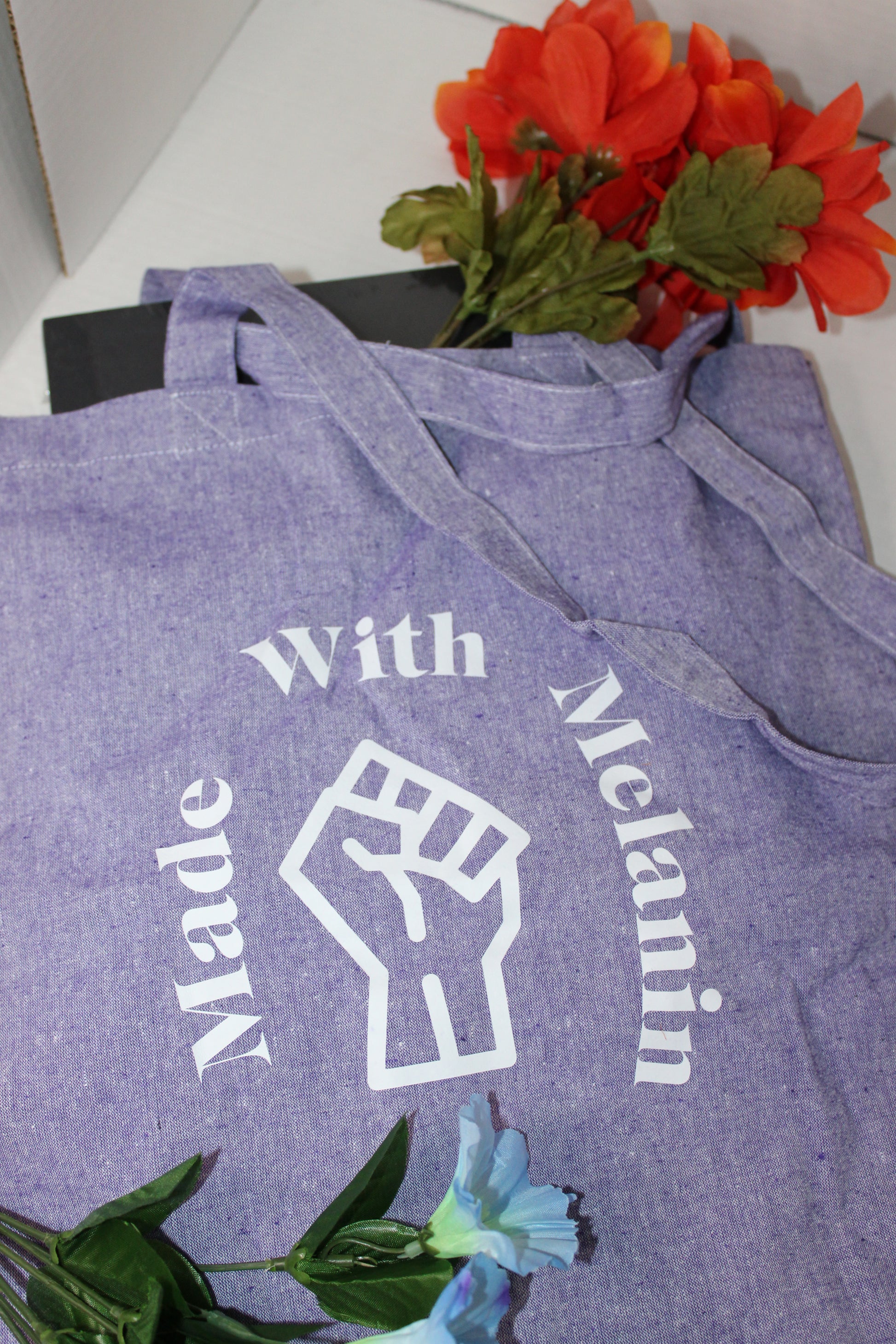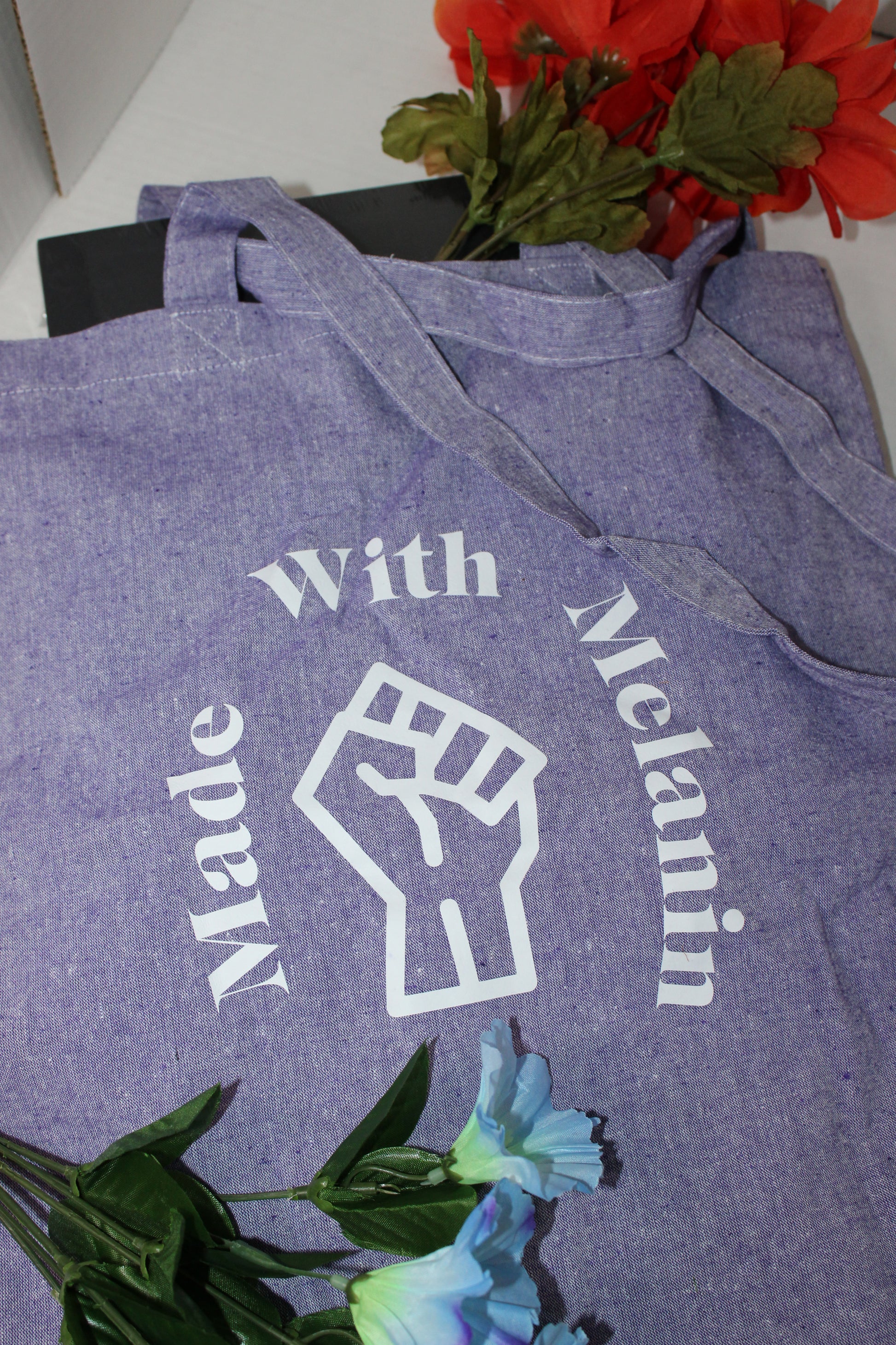 Featuring a sleek design adorned with the phrase "Made with Melanin," this tote is a declaration of pride and confidence. Whether you're heading to the market, hitting the beach, or running errands, let this bag be a reflection of your unapologetic embrace of your identity.